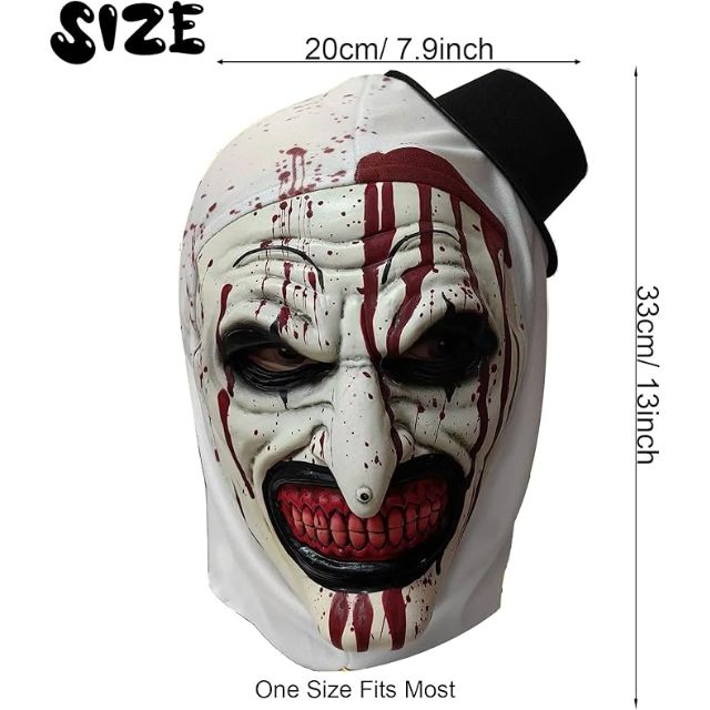Atrévete a encarnar al payaso más perturbador del cine con esta máscara de miedo inspirada en Terrifier, perfecta para convertir cualquier fiesta en una auténtica pesadilla. Su diseño realista incluye dientes ensangrentados, rasgos terroríficos y expresión espeluznante, cubriendo toda la cabeza para un efecto impactante.